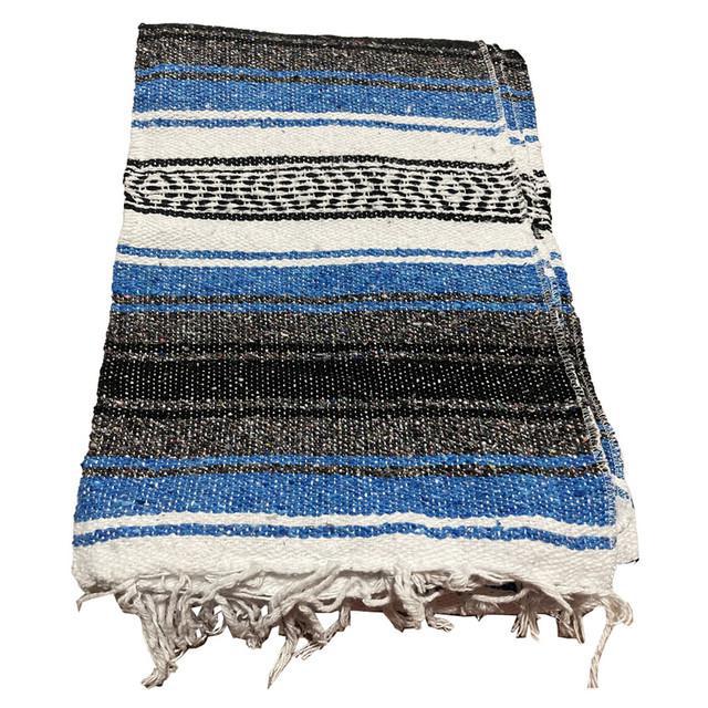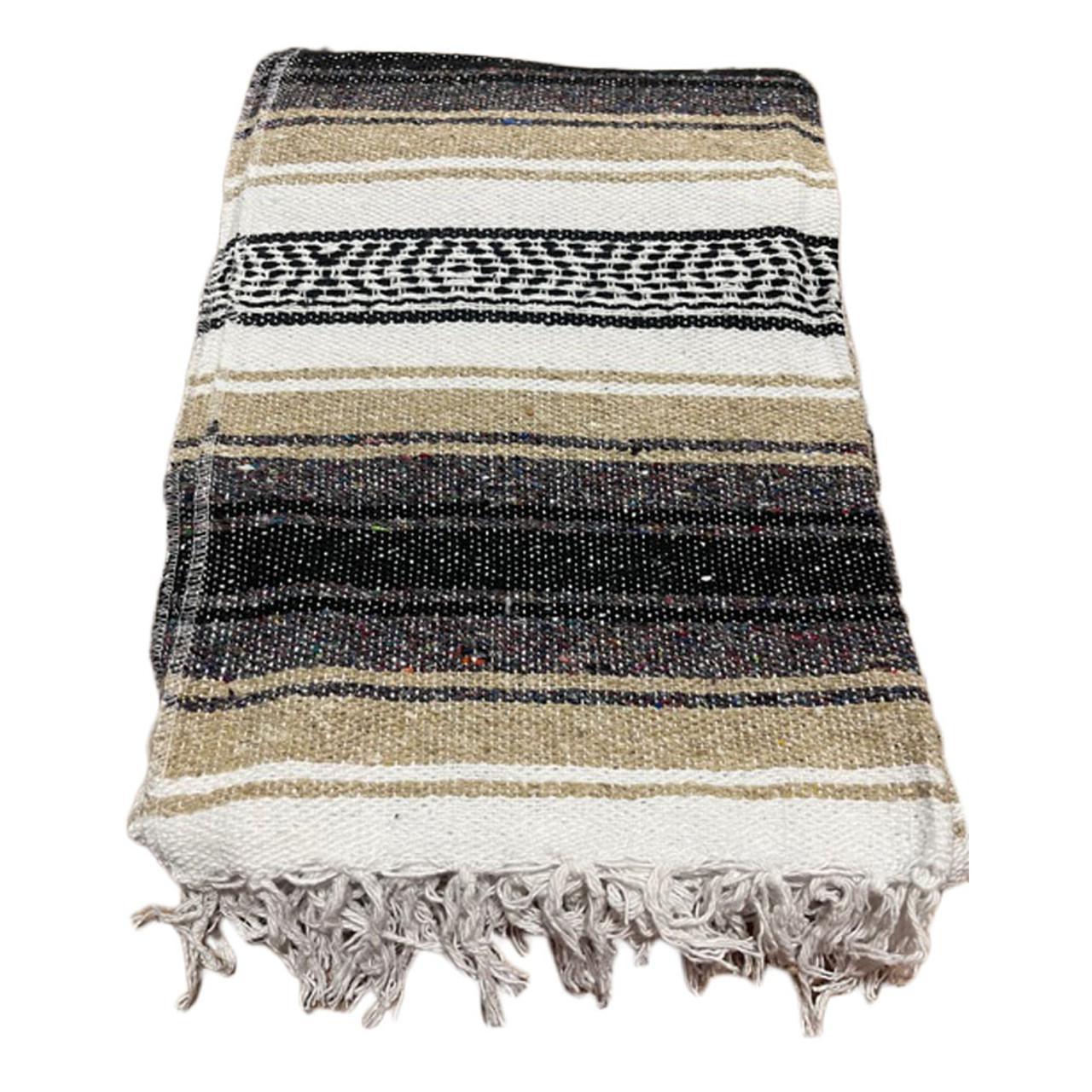 Falsa blankets are a popular western-style accessory and decor for their practicality and aesthetic appeal. This traditional falsa blanket in beige, white, black, and gray, with fringe on the ends is a great accent piece both inside and outside the house. Falsa blankets can be used as a blanket for yoga, picnics, camping, and sporting events!