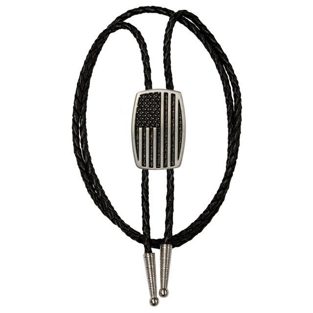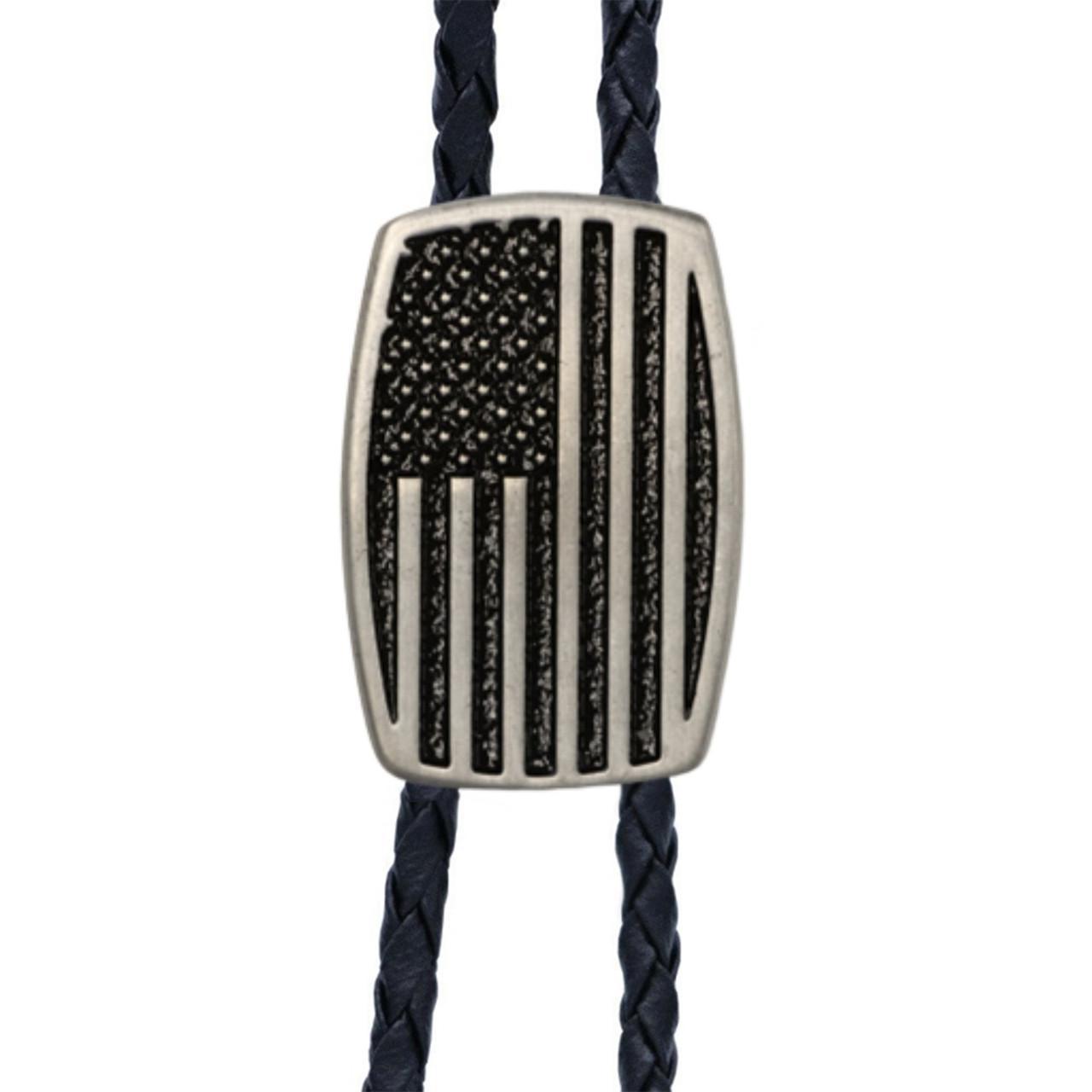 The USA Flag Brushed Aluminum Bolo Tie features a proud American flag design in a satin finish, blending patriotism with Western tradition. Set on a strong braided black cord with matching silver-tone tips, this bolo tie is a bold and stylish way to show your country pride—perfect for holidays, events, or everyday wear.