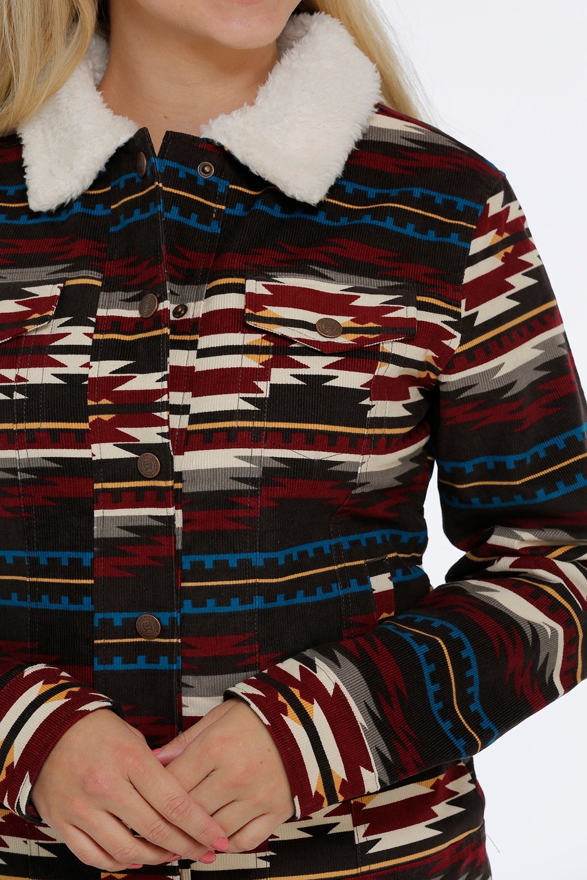 Crafted in a beautifully patterned Southwest-inspired print, this multicolored trucker jacket has all the Western vibe you need to complement any blue jeans and cowgirl boots. Designed with warmth and range of motion in mind, this striking jacket is crafted in cotton-spandex stretch corduroy with cozy sherpa fleece lining, copper snaps and a faux leather CINCH logo label.